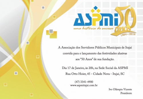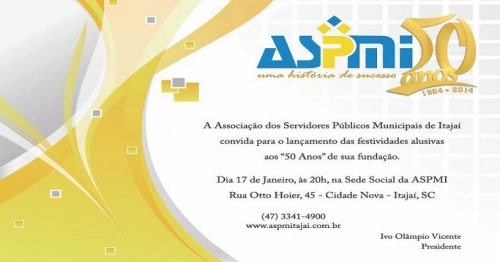 A Associação dos Servidores Públicos Municipais de Itajaí convida para o lançamento das festividades alusivas aos "50 anos" de sua Fundação.